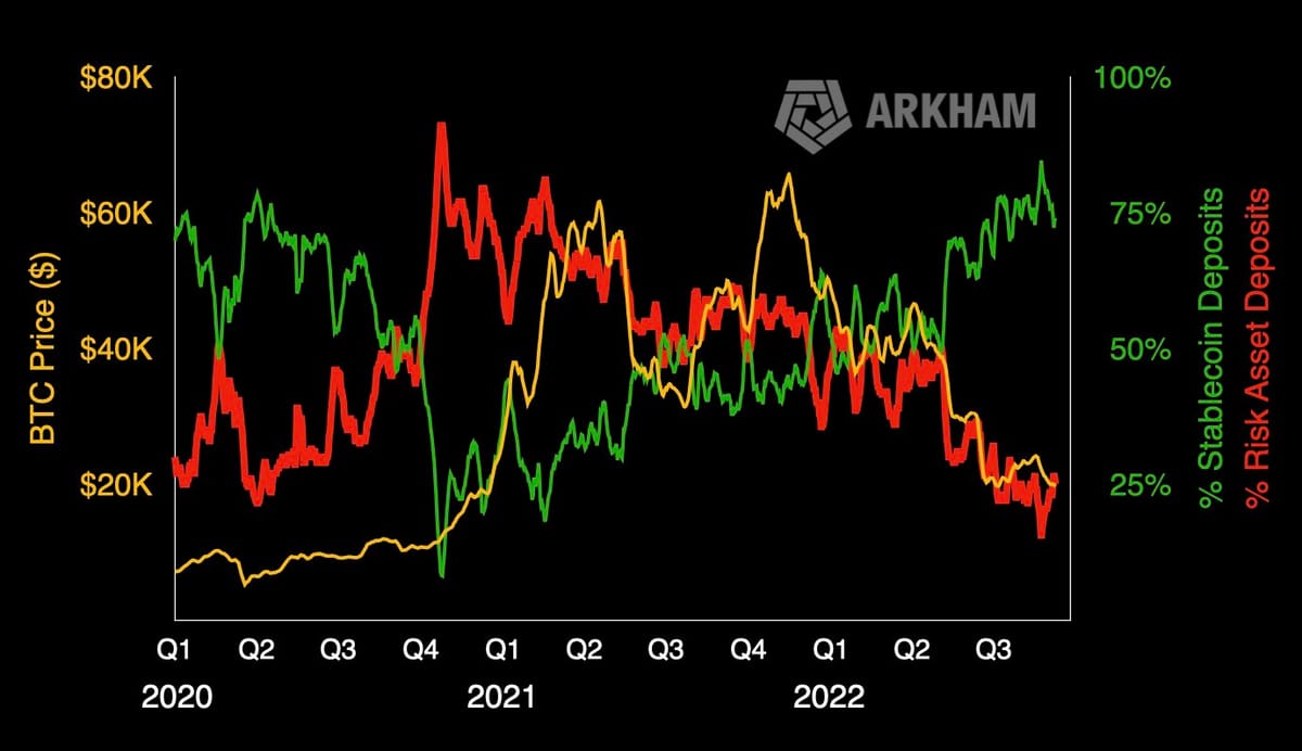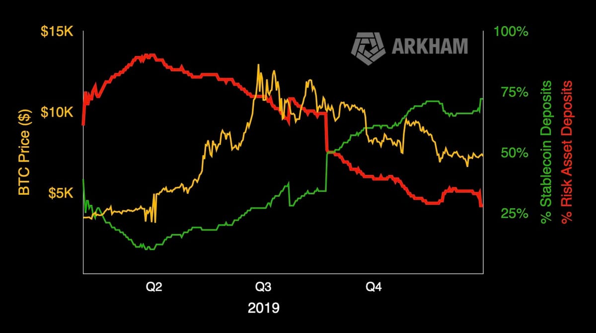 5) Around July of this year, stablecoins began to dominate exchange deposit volumes, coinciding with the drift into the current bear market. What does this data tell us?