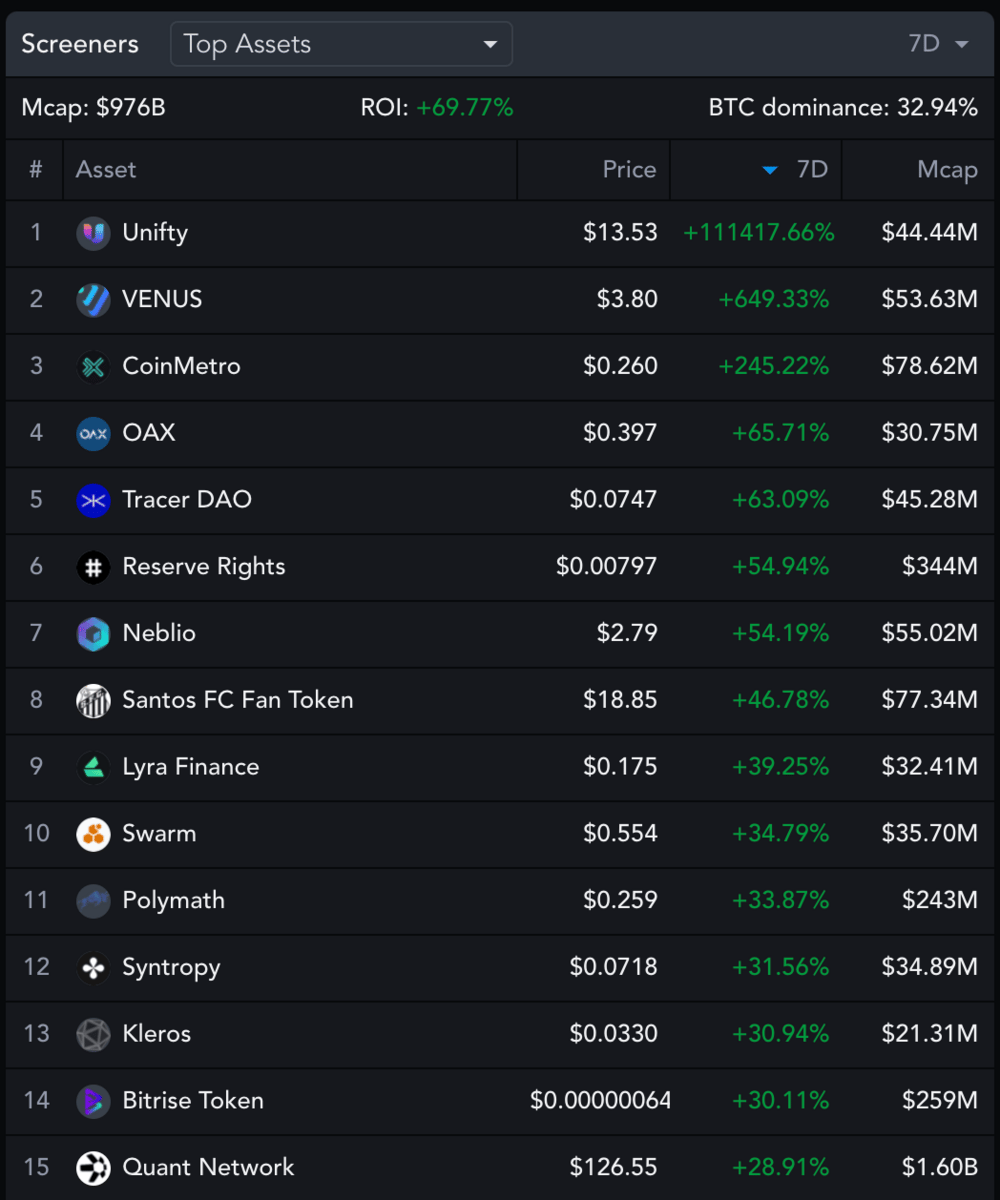 Here are the top 15 performers in the last week from all tokens with a market cap of $20M+.