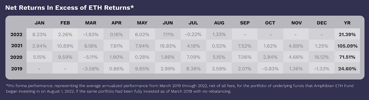 Amphibian Capital has two funds -- a USD-denominated fund and an ETH-denominated fund. For the sake of this article, we’re focusing on the ETH-denominated fund.